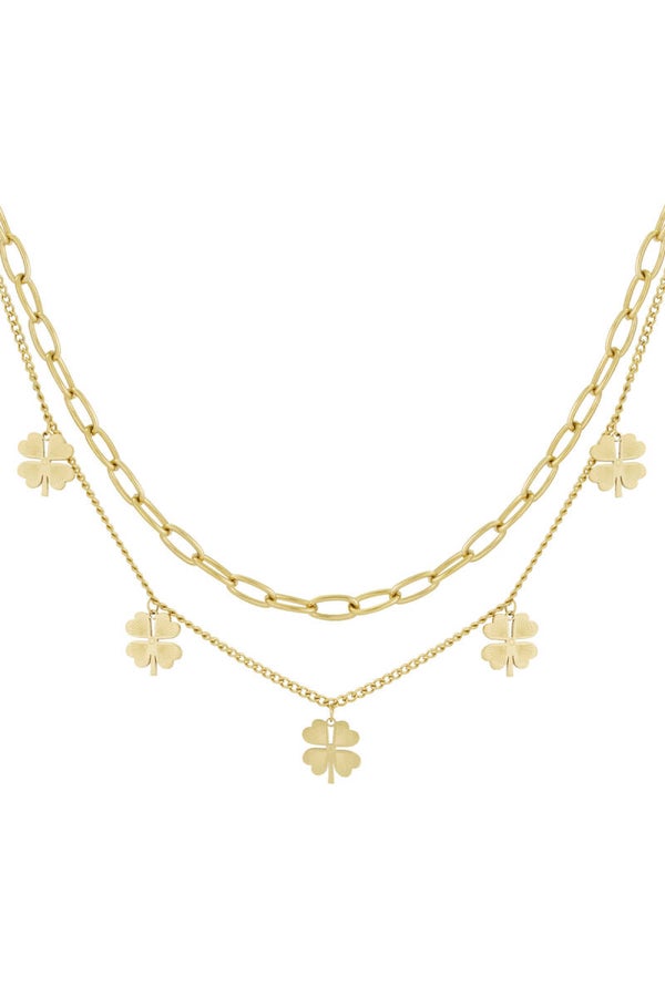 Deze charmante dubbele ketting combineert een schakel ketting met een speels ontwerp van hangende klavertjesvier, symbool van geluk. Gemaakt van stainless steal. Deze ketting biedt een veelzijdige look die zowel casual als feestelijk is. Beschikbaar in goudkleurig en zilverkleurig stainless steal.