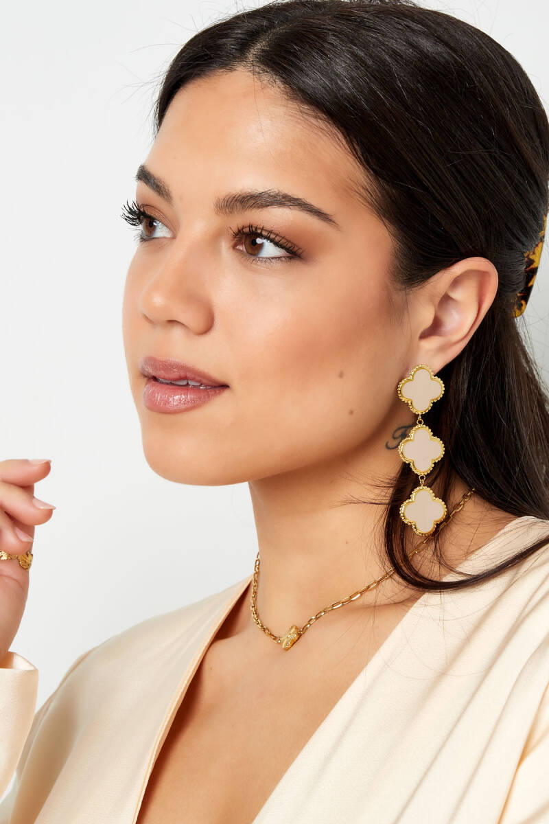 Trend alert!! Hoe leuk zijn deze gouden oorhangers met drie klavertjes. De oorbellen zijn perfect voor een feestje. De oorbellen zijn gemaakt van Stainless steel in combinatie met enamel en hebben een lengte van 7,7 cm. Verkrijgbaar in de kleuren: roze en lichtroze